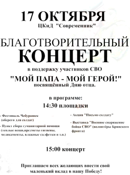17 октября в ЦКиД "Современник" состоится благотворительный концерт в поддержку участников СВО "Мой папа - герой!"